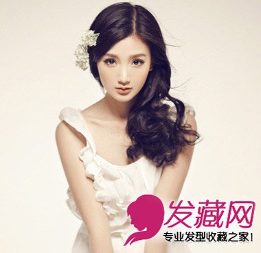 ,很适合轻熟女的妩媚清新烫发,斜刘海修饰脸型,发卷堆叠在一侧肩上,浓密蜷曲,搭配发饰,很优雅的公主气质。