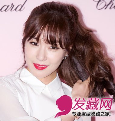 甜美的韩式长卷发扎高马尾辫造型,蓬松的螺旋卷长发空气感十足,扎马尾辫优雅知性,精致妆容搭配艳丽红唇,吸睛亮眼的