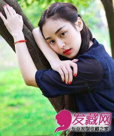 ,清新的露额长发,公主头扎发很有清新甜美的淑女范儿,搭配红唇复古,柔顺直发显得飘逸动感。