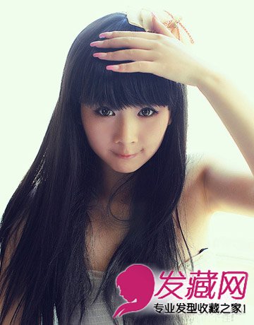 可爱的学生发型,齐刘海直发,没有任何修饰的黑发,天真的笑容,大大无邪的眼睛满满的都是轻灵单纯气息,再加上一个好看的发饰,清新甜美。