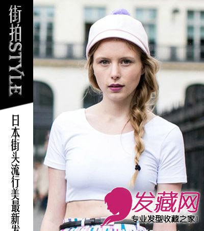 小编点评:编发是非常百搭的一个造型元素,将头发全部梳在一侧,编成松散的三股辫,再搭配上一顶小圆帽,立马抓住了街拍焦点。