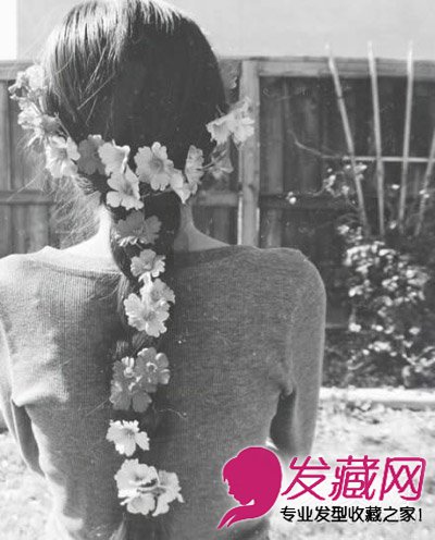 先将头发编成麻花,用花朵做一个花环,在马尾上也别上小花,很适合度假海滩的发型。
