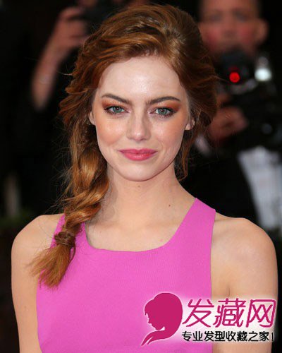 艾玛·斯通亮相2014纽约大都会博物馆时装庆典。棕红色的眼妆与橘色系腮红摩登感十足,同时与棕黄色的发色搭配的十分协调,简单的侧编发清新时尚,发顶的蓬松感很好的修饰了脸型。