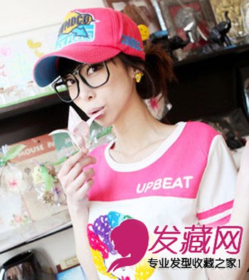 发型,浓密长发在脑后扎清新的低发髻造型便于戴帽子,搭配甜美的糖果色造型,俏皮可爱。