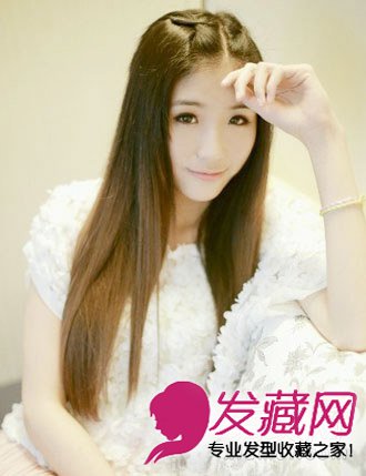 到了夏季,很多女孩喜欢把刘海弄起来,像这样中分的长发,分别编制夹在发顶,显出女生自信柔美的个性。