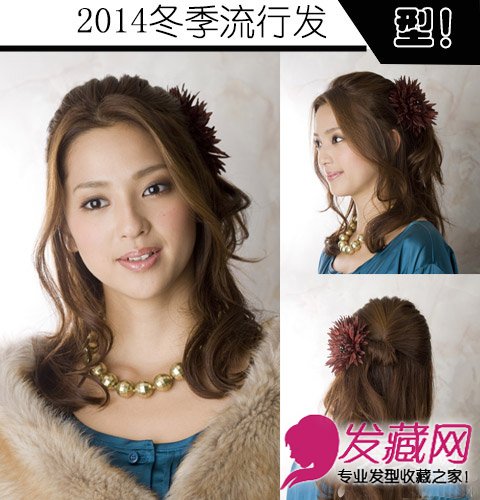 散落的中分刘海修饰小脸,上面扎起的头发用花样修饰,大波浪卷烫的头发和亚麻色染发时尚潮流,尽显女人妩媚。