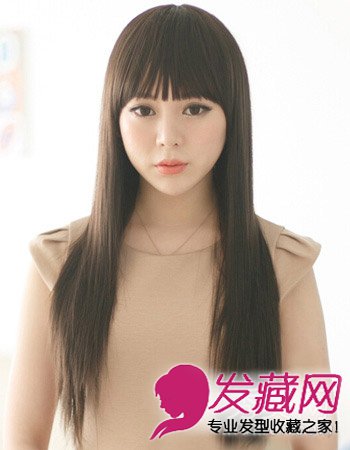发型,显得十分纯美好看,再加上齐刘海的发型设计,很好显修饰脸型,是一款韩味十足的长直发。