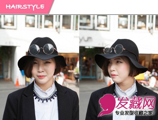 发型2斜刘海短发短短的头发稍稍遮挡脸颊,同时斜分刘海进一步修饰脸型,佩戴的宽檐帽不仅时尚还让脸型得到修饰,你也可以试一试喔。