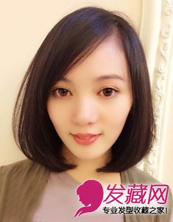 完全贴合脸部轮廓和颈部线条的发型显得乖巧清纯,斜刘海的