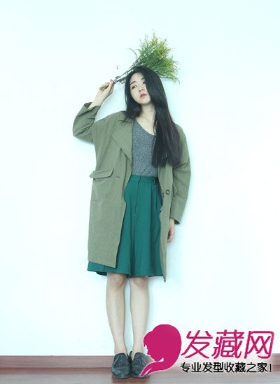 ,中分的长发随意的披在肩头,绿色的半身裙让人感觉很是舒服,长长的