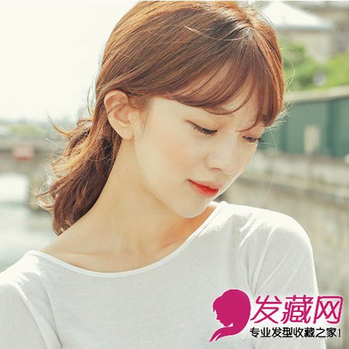 烫卷的长发,染上棕色,搭配空气感薄刘海,再把卷发绑起,可以将脸修饰得小一点,同时也凸显温婉气质。