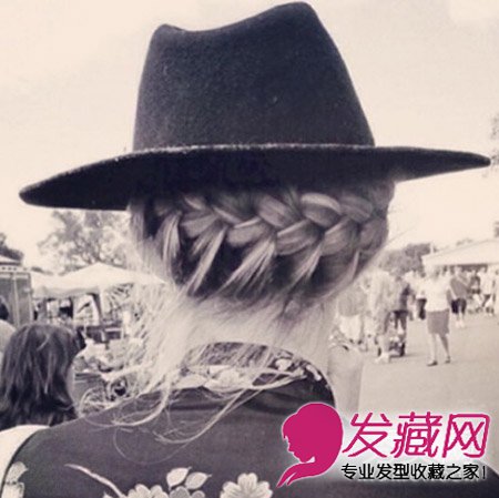 :帅气十足的修饰感超强的礼帽,压得低低的修饰长脸,将后面的长发编成麻花并盘起来放在后面,个性时尚又不失小女人妩媚。
