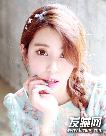 清甜的侧边麻花辫不仅简单而且颇有气质,编发显得简单而且时尚,加上发饰点缀勾勒出小清新的一面来,加上染发也是15年女生值得尝试的发型。