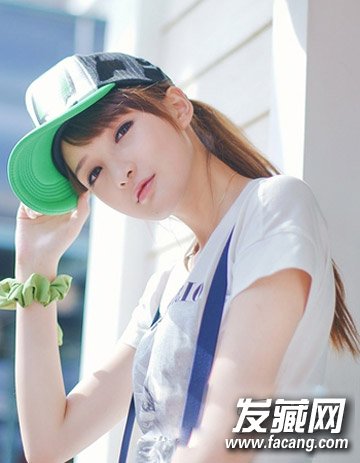 性格开朗的女生比较适合运动装束, 所以一款清新的吊带衫搭配上个性的高马尾发型不仅简单而且时尚,当然了搭配上鸭舌帽效果就更好了。