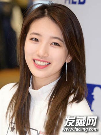 棕色的中长发,打理成中分的披肩发型,自然的垂落下来,清新简单又不失时尚气质,搭配甜美的笑脸,红红的嘴唇,女人味十足。