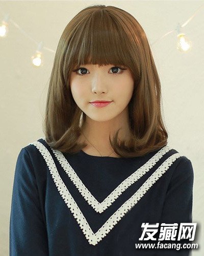 如奶茶般的温暖发色,使得整体造型充满了乖乖女孩的文静气息,发尾的微卷处理,视觉上也是非常饱满,长到眼眉的刘海,能让脸型看上去小上一号呢