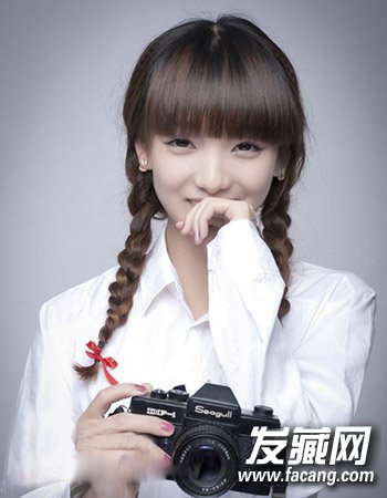 ,齐刘海搭配可爱的麻花辫,可爱范十足。