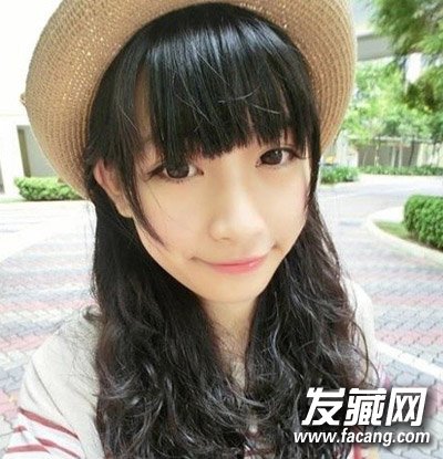 很具日系风格的一款中长蛋卷烫,稍微遮眼的碎碎齐刘海很萌很天真,黑色的小卷发丝给人俏皮的感觉,搭配一顶帽子很有度假风。