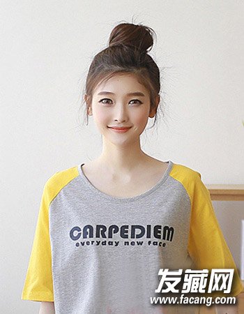 闷热的夏季当然少不了一款清爽的扎发发型了,而在所以扎发中这种高耸的丸子头可以说是最简单也是最显清爽感的,再配合无刘海形式的造型设计与运动型的T恤衫同样活力吸睛。