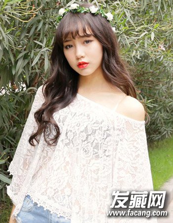 同样是甜美感十足内扣空气感刘海造型设计,而清新低调的深棕色染发设计与简单的长发烫发造型,头顶一个简单的花环造型设计更添十足浪漫淑女风。