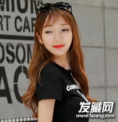 利用清新空气感刘海来塑造出女生的灵动可爱感,而配合这种时尚的棕色染发颜色与简单的长卷发造型同样很显浪漫唯美风。
