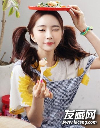 一款气质的双马尾发型的设计,凸显出少女的天真与烂漫来,而且蓬松的卷发马尾勾勒出别致的时尚感来, 无刘海发型自然有魅力。