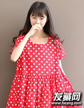 乌黑亮丽的自然发色可是最显女生十足的清纯气质风的了,而搭配这种简单的齐刘海造型设计与浪漫的长卷发更添十足可爱甜美气质感。