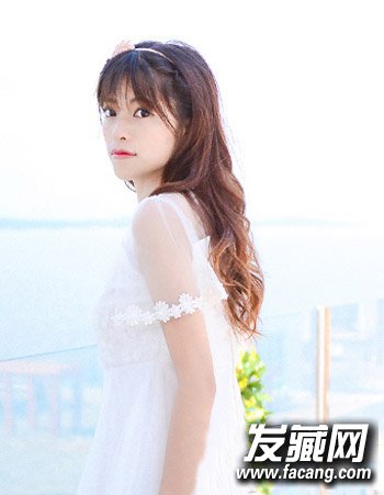 ,简单的空气感刘海造型清新自然,而利用时尚的棕色染发设计与浪漫的长卷发设计,一个简单的发箍造型更添十足的甜美可爱感。