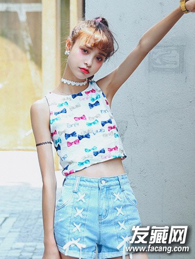 将长发完全扎起来吧,空气刘海加上丸子头凸显女生可爱气质,瞬间减龄不少,夏季更是清爽减龄。