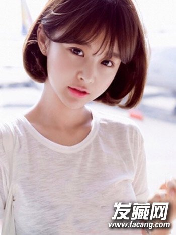 ,甜美的齐刘海短发搭配内蓬设计,很有修颜的效果,蓬松短发清新可人。