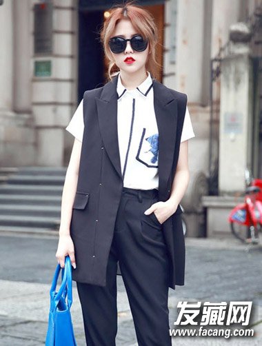 设计显脸瘦,扎成低马尾搭配黑色西装,时尚干练。