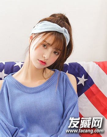 采用的是明亮的棕黄色染发颜色来增添女生的时尚感,而搭配清新灵动感十足的空气感刘海造型与高马尾的扎发设计,一个简单的发箍更添矮个女生的青春活力感。