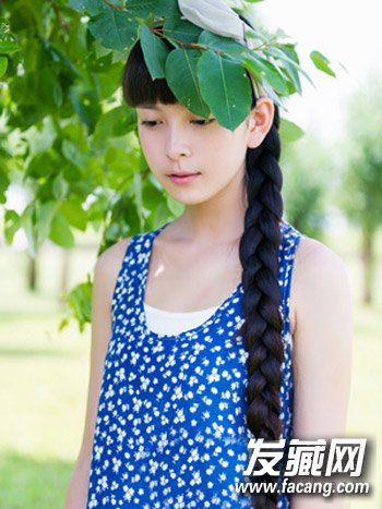 很有可爱少女气质的一款简单扎发,乌黑的齐刘海长发扎麻花辫发型,清新扎发修颜显嫩。