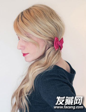 侧梳低马尾就更加简单了,但是如果加上蝴蝶结发夹的点缀,就会让这个简单的造型瞬间为你加分,可以帮助你提升优雅气质哦。打造方法非常简单,就是先将头发按照侧分发方式做分区,然后将所有的头发全部梳到发量多的一侧,用头绳固定,然后再固定位置搭配上蝴蝶结发夹就完成喽。