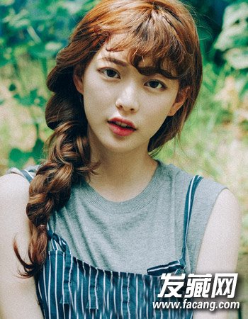 ,烫发刘海与侧边编发的搭配,时尚的黄棕色与侧边编发完美的拗出时尚感来,而且抢眼的发色时尚大气。