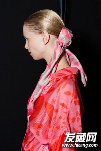 发髻最适合:头发梳得非常光洁,脑后扎起的发髻最适合用小号的丝巾包住,并且打结后自然下垂。