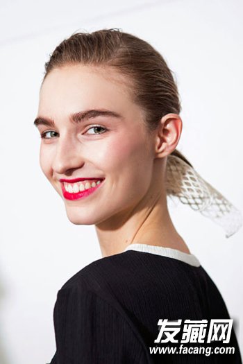 低马尾最适合:不用丝质的丝巾,而是用布面或者镂空的丝巾,系住发尾就可以了。
