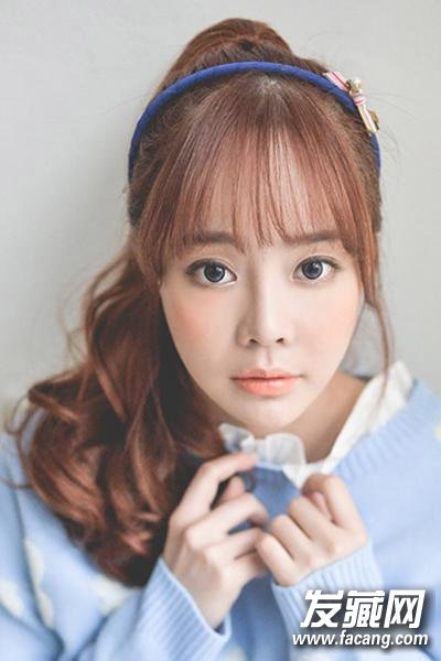 空气刘海搭配卷发马尾,两种不同发型完美搭配,增加层次感,彩色发箍点缀整个造型,清秀精致。