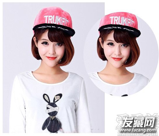 再搭配的是厚重的斜刘海发型设计来增添小女生的温柔气质感,搭配时尚而温暖的棕红色染发颜色与内扣形式的波波头更添活泼可爱感。