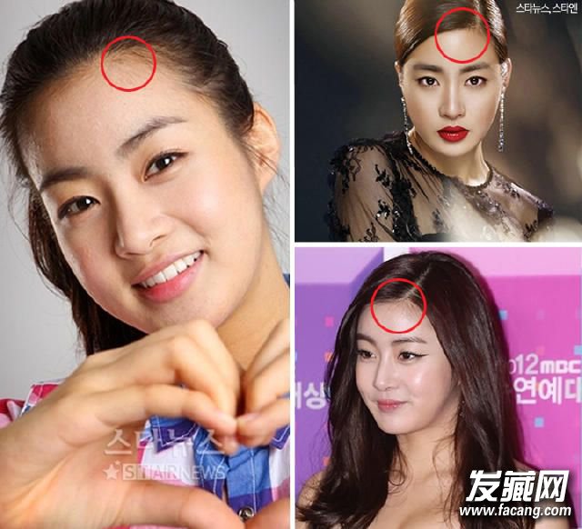 方形额头会显得脸比较大,可以学姜素拉,通过发际线梳理,让额头看起来圆圆的,这样可以显脸瘦。