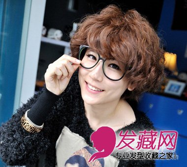 蓬松的纹理式短卷发,精灵活泼,卷卷的刘海更凌乱可爱,浅棕色的染发青春时髦,搭配黑色眼镜框更古灵精怪的感觉。