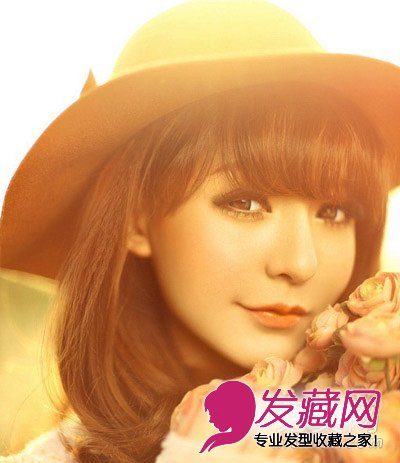 淡淡的妆容很迷人,内扣的齐刘海精灵可爱,优美弧度的中长直发梨花头搭配礼帽春夏日出游最有风情哦!