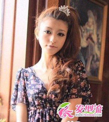活泼可爱的长发烫发发型,利用简单的马尾束发,让造型充满阳光活力。闪耀的水晶皇冠发饰,让简单的造型瞬间闪耀。