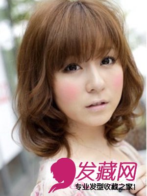 非常具有卖萌嫌疑的一款刘海发型!轻薄的齐刘海微微遮住了眼睛,一双炯炯有神的大眼立马显示了出来!将头发的长度控制在及肩部的位置,从颧骨处开始打造出让略微有点外翻的卷度,瞬间提升了女生的可爱度!