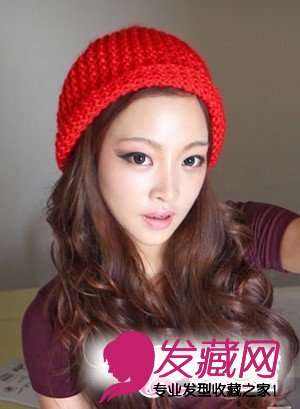 火红色的帽子是这款韩式烫发发型提升魅力指数不可缺少的单品呢。从发干开始做出的自然大卷弧度,很有女人味的说。沿连旁边的发丝不经意的修饰了脸型,不刻意的打造出巴掌脸蛋的效果,女人味的烫发发型加上精致的妆容,完美。