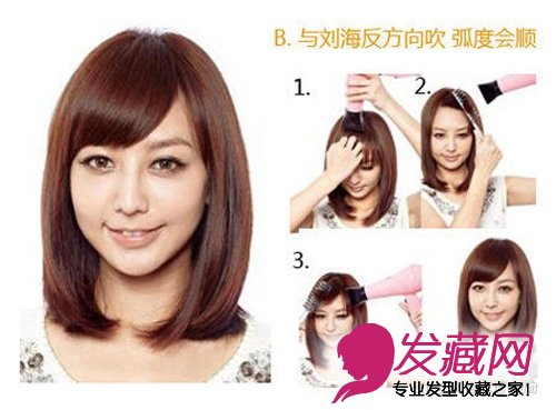 2用弧型梳把头发由下撑起,先往与斜刘海的反方向吹整。
