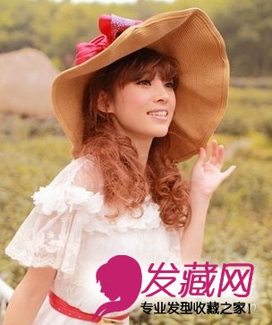 发型分成两束,分别搭在女生的肩膀上,发丝间运用绵羊烫发的设计,呈现出丝丝规则的卷曲效果,一顶宽檐帽凸显了女生的森系美丽。