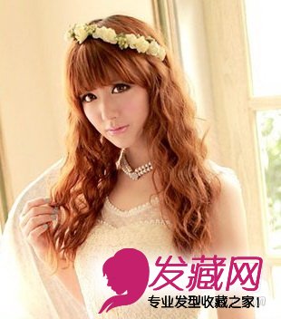 女生中长发烫发发型,更显女性的性感浪漫气质,波浪卷的烫发发型,令烫发发型更加时尚有型,融入棕栗色的染发颜色,增加了烫发发型的时髦感,花朵花环的搭配,犹如花仙子梦幻的感觉。