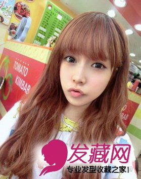 微微卷曲效果打造的烫发发型,更为优雅自然,加染上棕栗色的染发颜色,不仅增加了烫发发型的时髦洋气感,同时也衬托出女生更白皙的肌肤,齐刘海的发型设计,将女生的双眼衬托的更大。