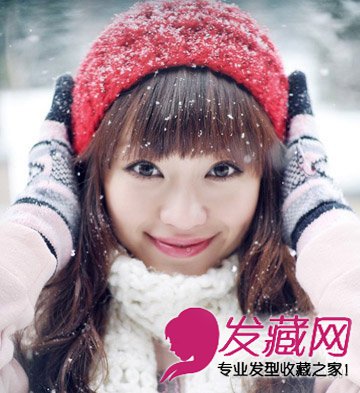 针织帽大概是很多MM最喜欢的一种帽子了,在戴这顶帽子时千万不要将头发全部扎进去,否则脸型不好看的MM会让人感觉更加笨重,齐刘海长卷发带上一款帽子,帽子与发型的搭配极具塑颜的效果。